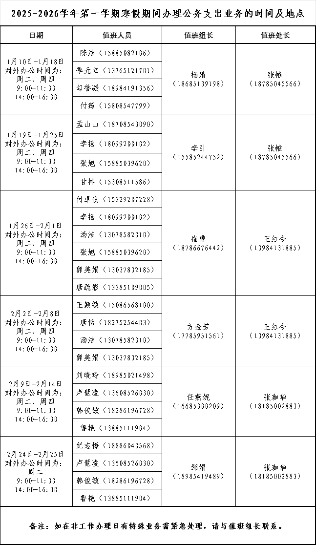 为保障学校工作正常推进,2026年学校预算已上账,我处寒假期间正常办理报销业务,值班地点为西区崇德楼一楼计划财务处,现将寒假工作值班表告知如下: